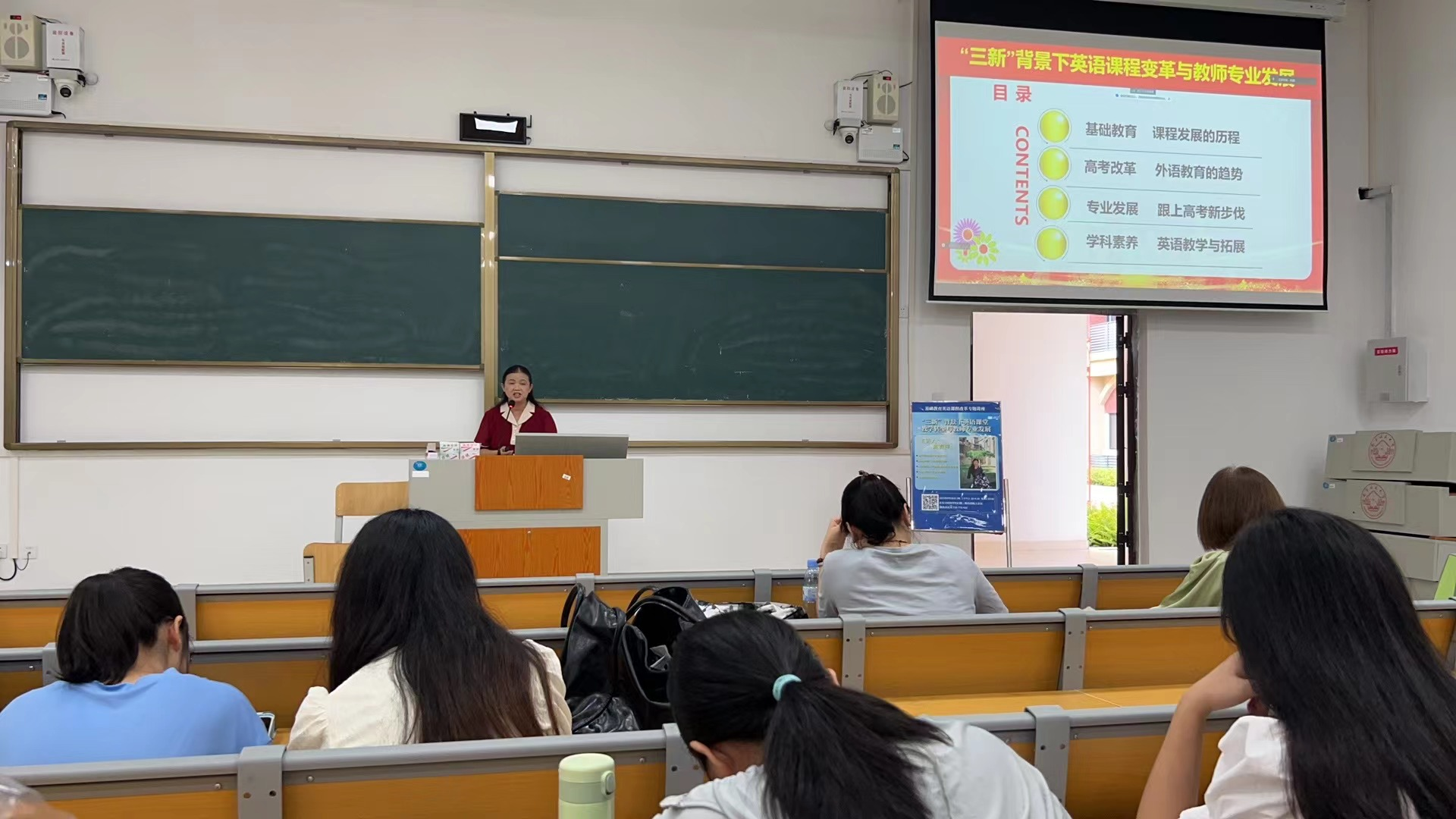 为促进英语专业师范生核心素养的养成,2023年9月26日下午,南宁市东盟中学党委书记、英语特级教师周春萍老师为英语专业师范生做题为《 “三新”背景下英语课程变革与教师专业发展》的专题讲座。本次讲座是英语专业《基础教育英语课程改革》系列专题之一,讲座由蒙岚副院长主持,邓芳娇老师、林绍丽老师以及2022级学科教学(英语)专业、2020级英语专业1-5班和陶行知实验班全体学生参加了此次讲座。