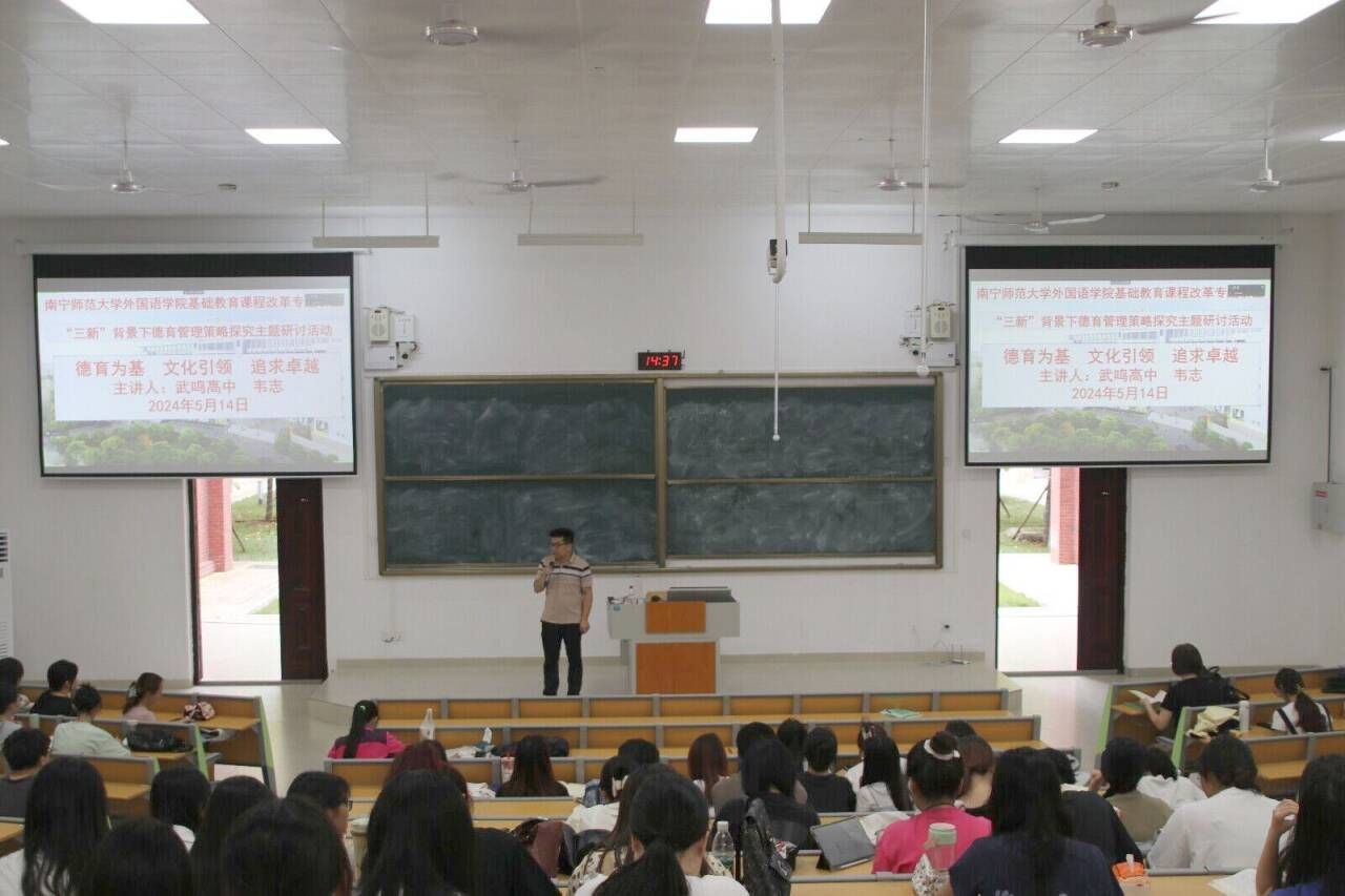 英语师范生班级指导能力,促进师范生教师综合素养的养成,5月14日下午,我院邀请了武鸣高中优秀班主任韦志老师在实验2-A105教室做题为《德育为基、文化引领、追求卓越》的专题讲座。本次讲座是我院2024年基础教育英语课程改革系列专题讲座之一,由我院邓芳娇老师主持,2021级英语专业全体同学参加。