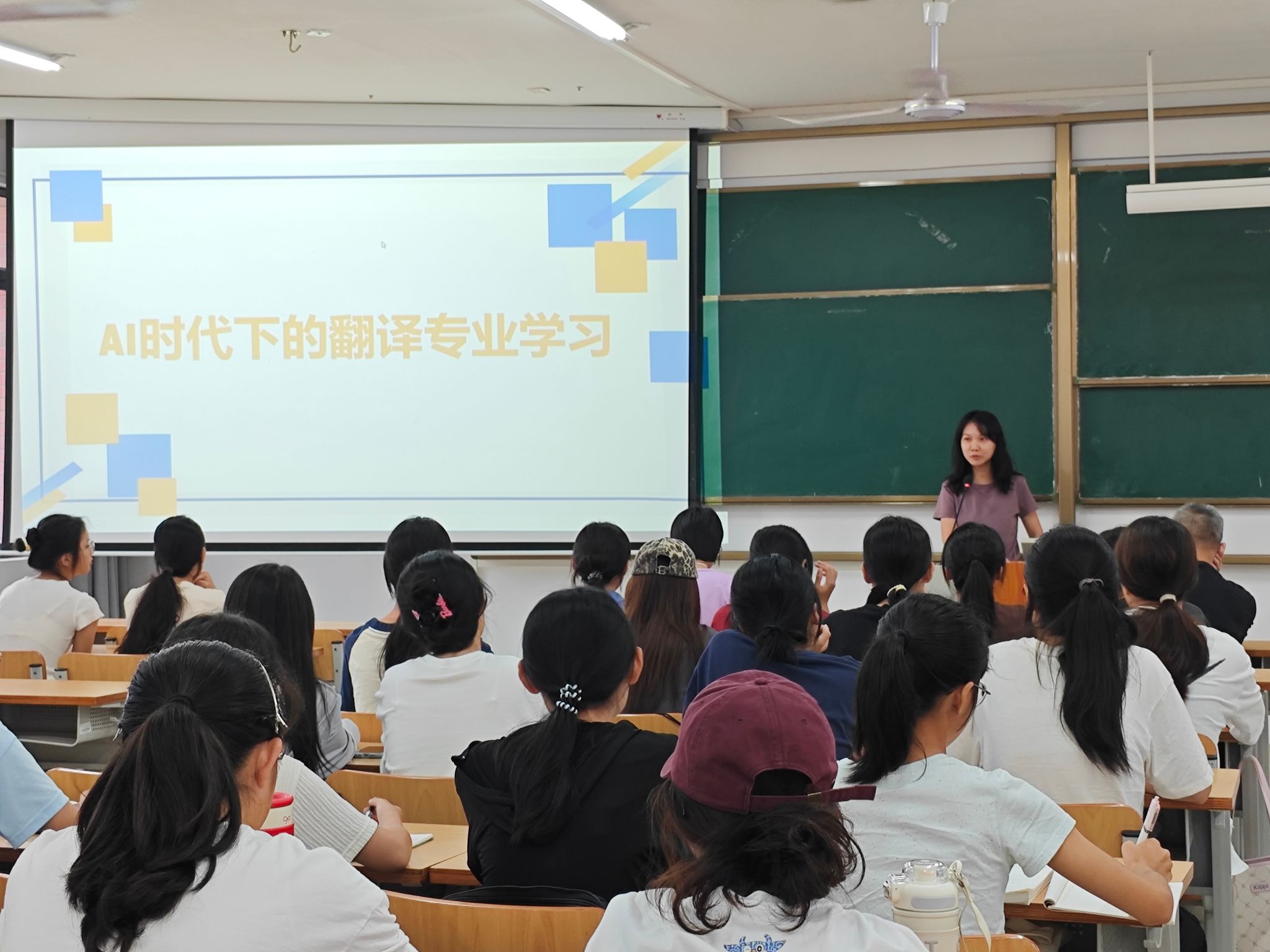 导学会上,侯艺东老师以《AI 时代下的翻译专业学习》为题进行精彩发言。她通过海明威《老人与海》中一个句子的 8 个版本译文,生动地对比了机器翻译和人工翻译的差异,深刻展现了学好翻译的重要性。侯老师还详细介绍了在 AI 时代如何利用智能工具,适应人机协同的新型翻译业态,并勉励同学们:“We have to think about these things as productivity enhancing tools, as opposed to complete replacements.”