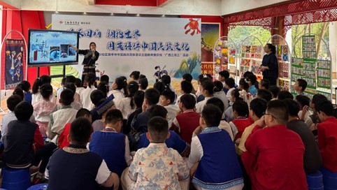 23行知班的李姿乐同学和孔春霞同学用英汉双语为南宁市天桃实验小学的同学们介绍了彰显广西壮乡民族特色的绣球,以及作为广西非遗传承——扎染的独特技艺。在讲解中,同学们用英语介绍壮乡民族民俗文化,配以趣味互动游戏和视频观赏,在场的小观众们兴趣十足,听得津津有味。