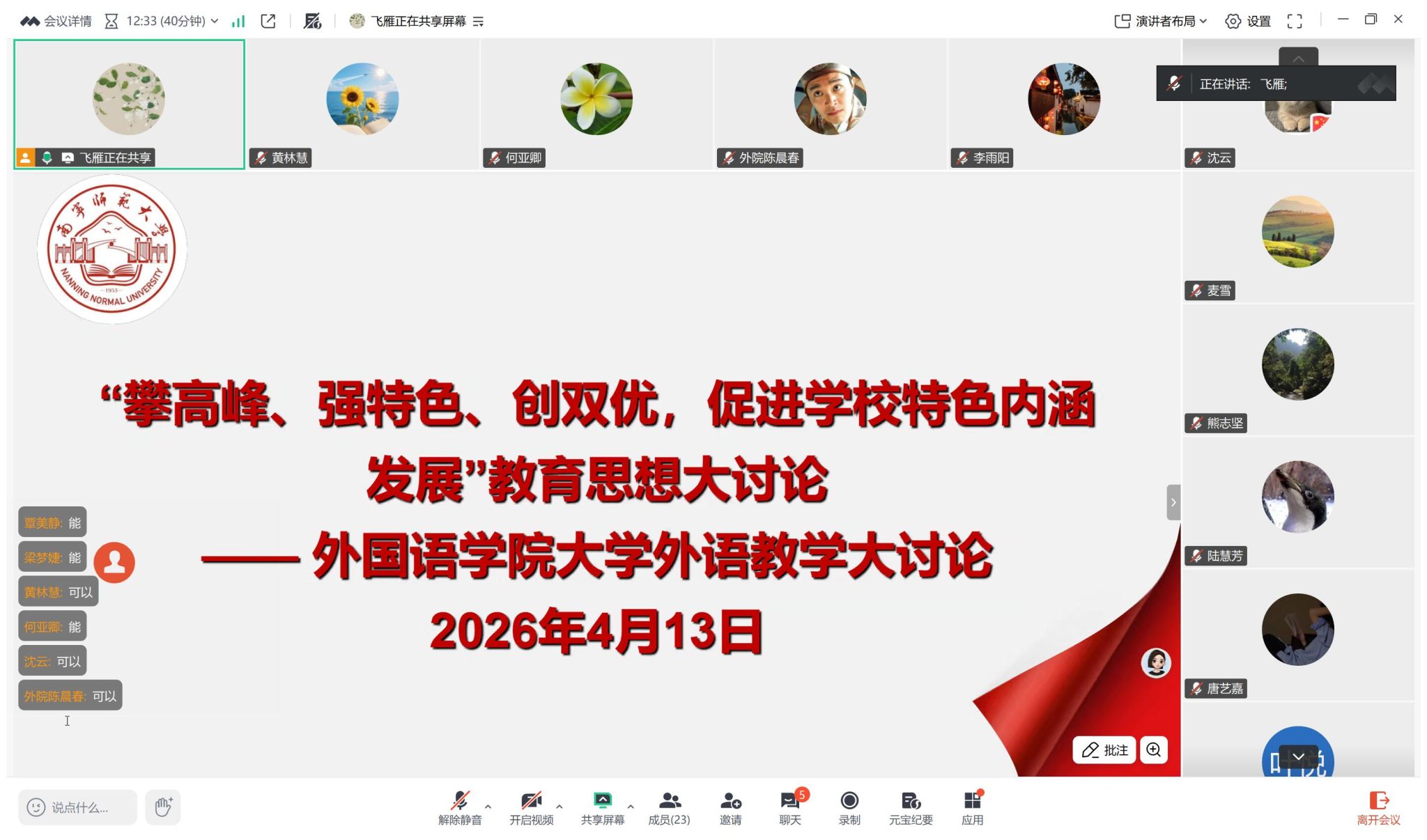 高飞雁副院长作总结,明确大学外语教学改革核心:优化教学内容、创新教学模式、强化师范特色、拓展服务功能,立足师范育人定位与地方产业需求,构建“通用外语+产业场景+师范应用+跨文化沟通”教学体系,实现教学与产业、人才培养精准对接,彰显师范外语教学特色。