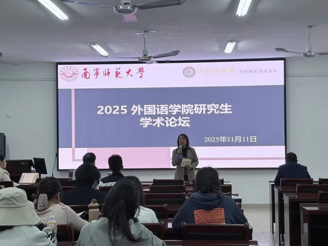 于2025年11月11日下午在实验楼1B-515、1B-516教室举行研究生学术论坛。本次论坛分为语言学与文学两个专场,陈光伟教授、蒙岚教授、黄信教授和赵凤玉教授出席语言学专场指导,姚本标教授出席文学专场指导。共有10位研究生进行学术汇报。