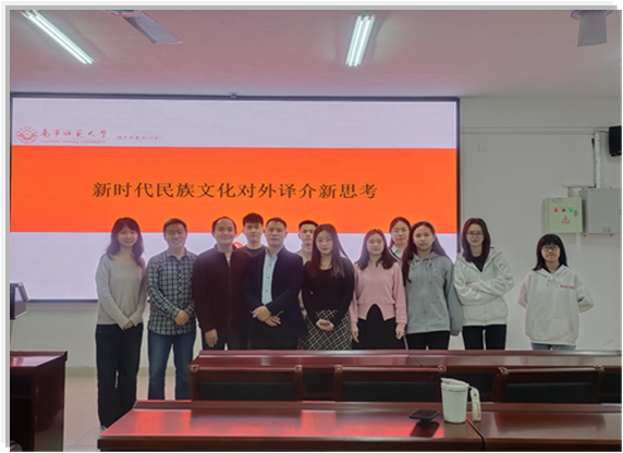 在武鸣校区实验楼1B-515教室举办了题为“新时代民族文化对外译介新思考”的学术讲座。本次讲座由黄信副教授主讲,学院部分教授及研究生参加了本次沙龙。