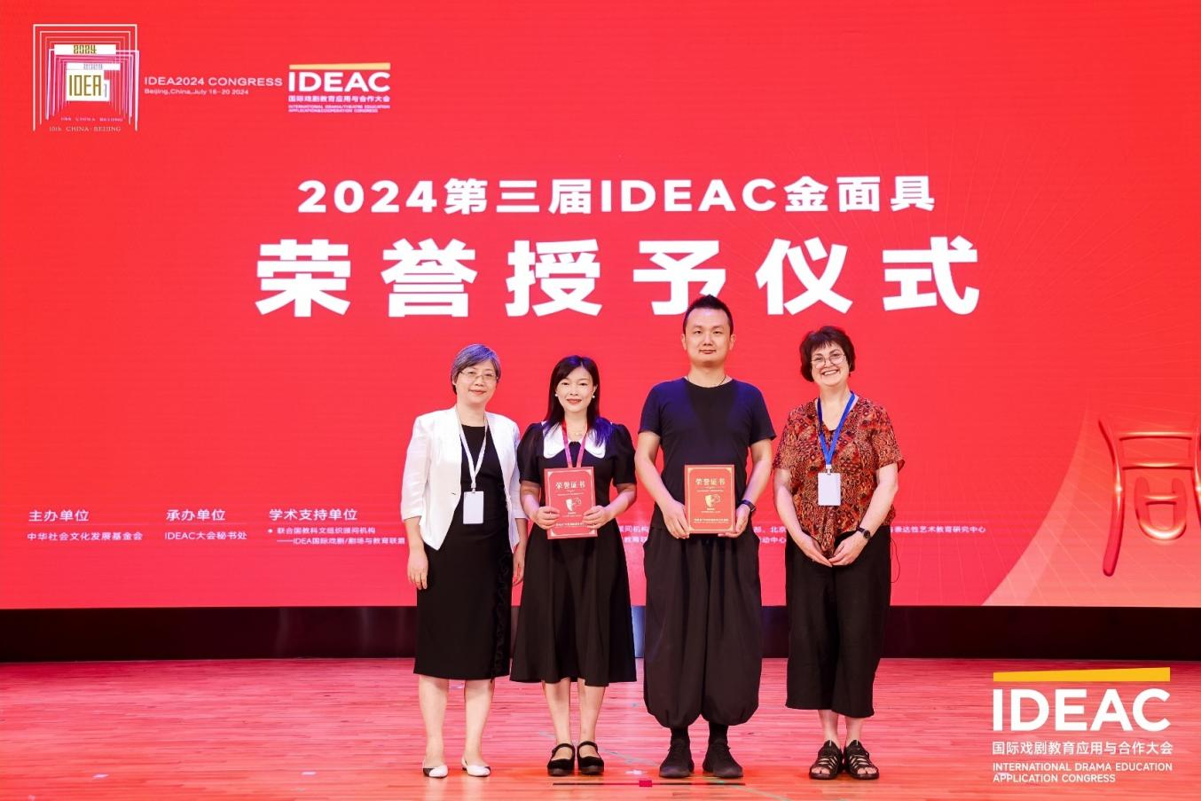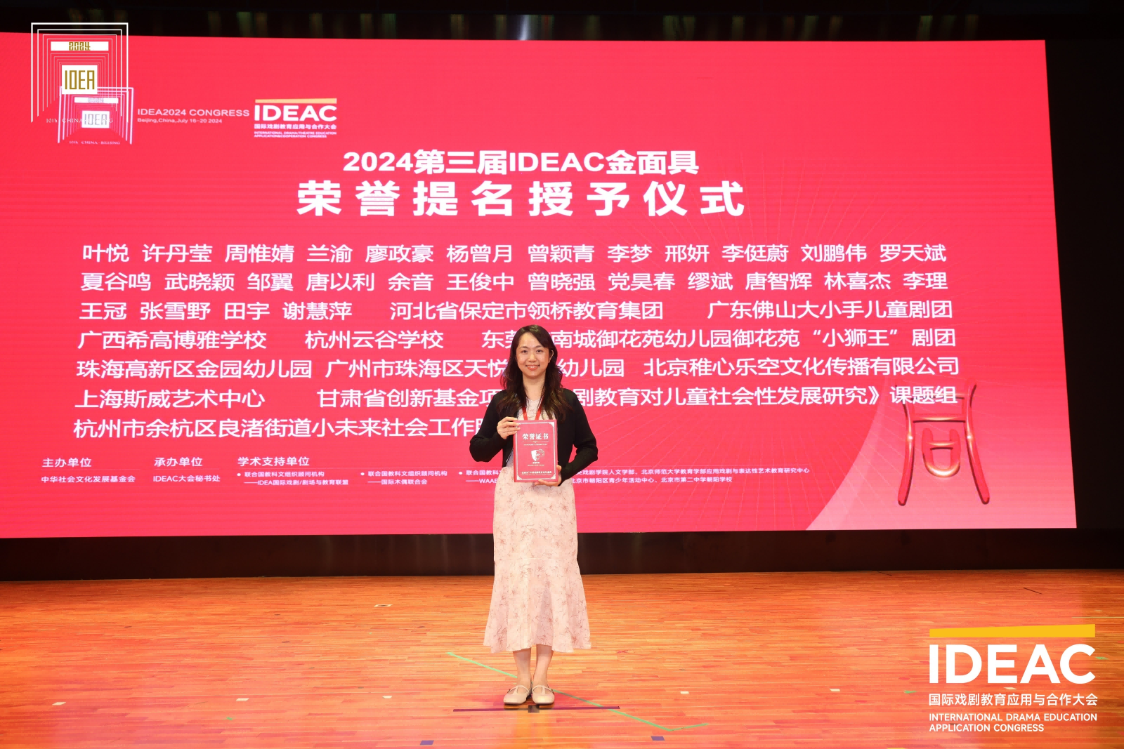 教育戏剧团队多年来在高飞雁副院长的带领下立足于广西民族地区基础教育实际,以铸牢中华民族共同体意识为主线,开发系列英语教育戏剧融合课程,通过专业选修课、校级公选课、专业课教学融合、国培、区培项目、城区教研活动、中小学校本教研活动等方式实践推广,在服务教育教学的同时不断讲好民族团结故事,传播优秀传统文化,团队获得2024IDEAC“金面具”戏剧教育成果双年展“金面具杰出戏剧教育管理者”荣誉,叶悦老师获“戏剧教育综合应用与实践金面具杰出教师”提名荣誉提名。在大会上,澳大利亚戏剧协会主席、澳大利亚墨尔本迪肯大学教育学院艺术教育(戏剧)教授乔·拉斐尔和IDEAC国际戏剧教育应用与合作大会副秘书长、中华社会文化发展基金会“美育与未来素养”公益基金副主任王丽英,共同为获得该奖项的国产自慰