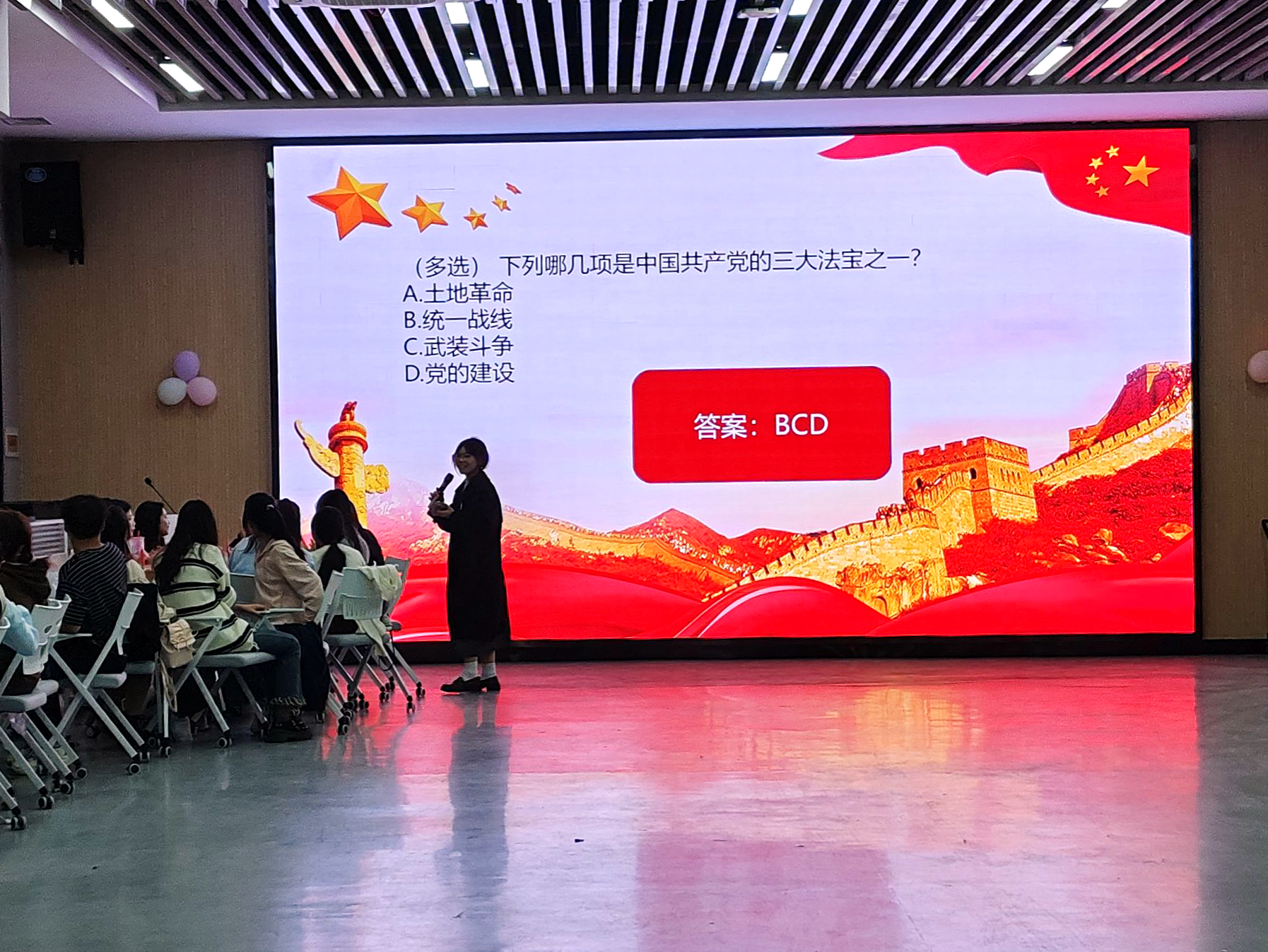 本次活动以部门节目表演拉开序幕,各部门精心准备的节目,不仅活跃了现场的气氛,也体现出各个部门独特的团队文化。每一个节目都是部门成员们创造力和团队协作能力的结晶,精彩的表演赢得了现场观众的阵阵掌声。随后红色教育电影放映环节给大家带来了一场视听与思想的双重洗礼,一部部充满力量的红色电影片段,如同历史的画卷在眼前展开。那些英勇无畏的英雄事迹、波澜壮阔的革命历程,深刻地影响着每一位观看者。红色知识问答环节更是将活动推向了一个小高潮。通过竞答的形式,大家对党史、新中国史、改革开放史、社会主义发展史等有了更深入的学习。紧接着是读书分享会环节,大家积极上台分享近期所阅读的书籍刊物,共同探讨阅读体验和心得体会,在分享与讨论中拓宽思维的广度与深度。最后,素拓实践培训为整个活动画上了圆满的句号。
