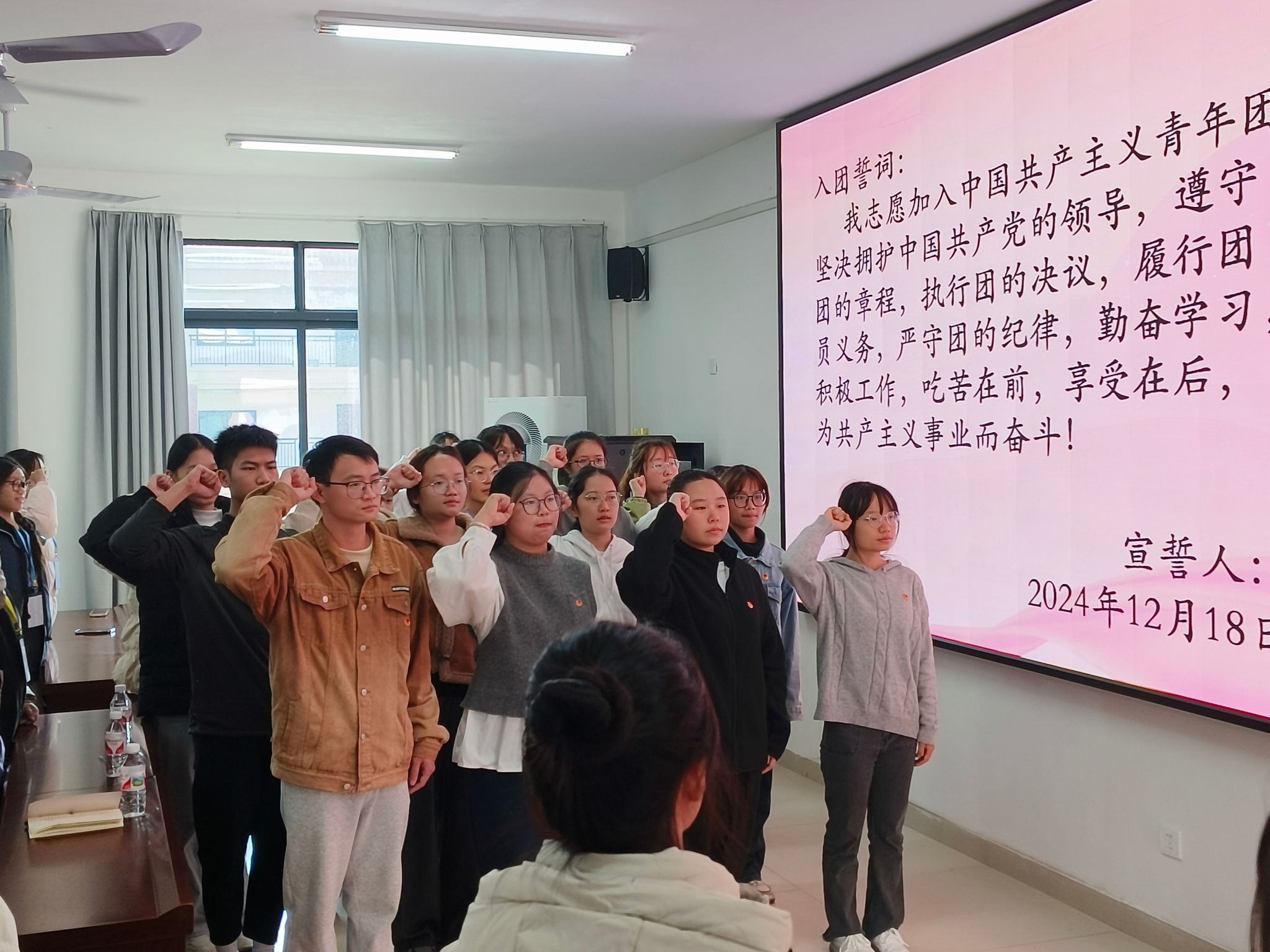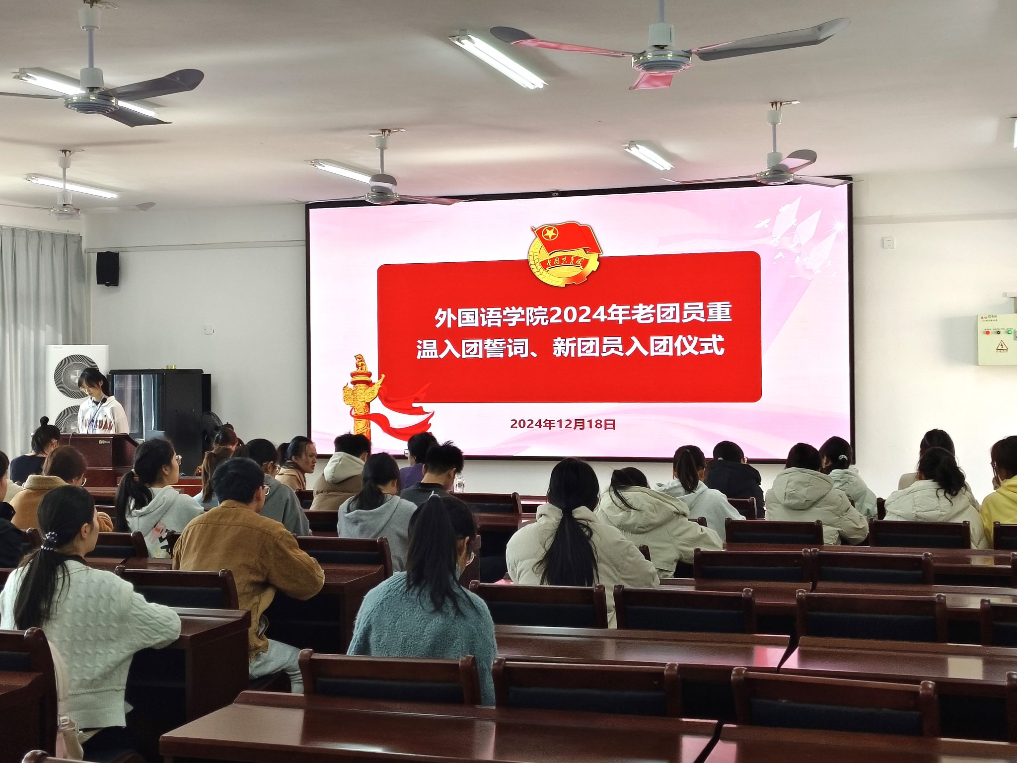 于2024年12月18日在武鸣校区实验楼1 - B515报告厅举行了2024年老团员重温入团誓词、新团员入团仪式。本次仪式由院团委组织部谢美玲同学主持,国产自慰