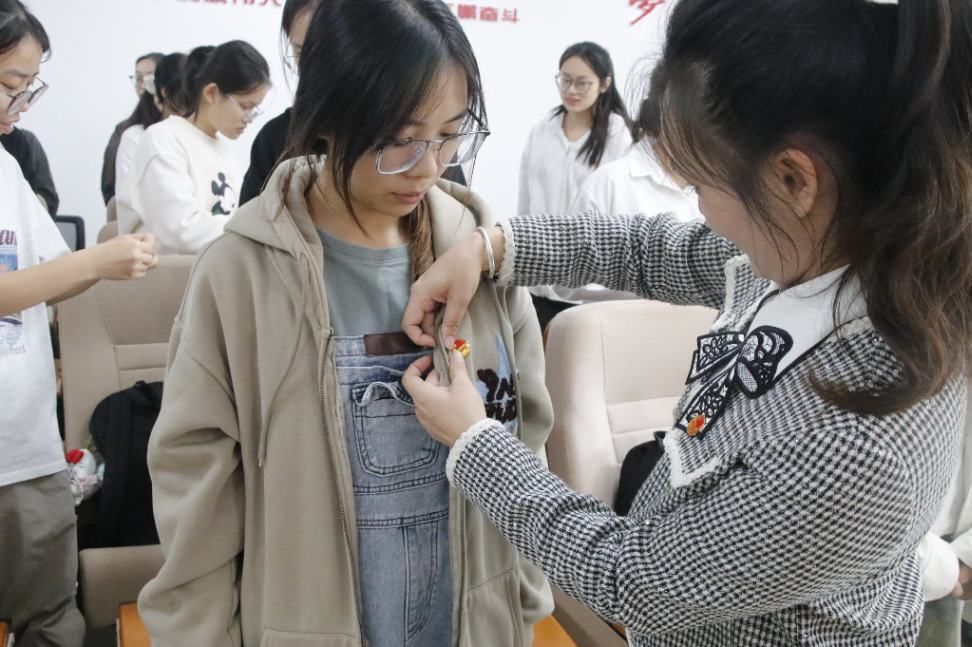 仪式在庄严的国歌声中拉开序幕,主持人宣读新发展团员名单,并向新团员表示热烈祝贺。随后,蔡梓晴老师与在场的优秀党员、团员代表一同为新团员佩戴团徽。在主持人的领誓下,全体新团员面向团旗庄严宣誓,铿锵有力的誓言表达了他们坚定的理想信念与青春担当。
