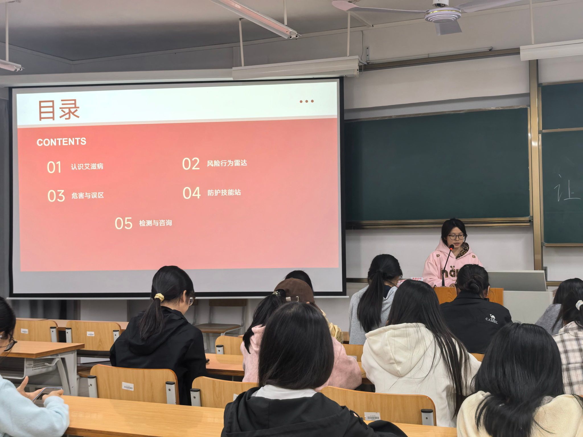 学院通过防艾主题班会,向同学们详细介绍了艾滋病的基本概念、传播途径与病毒作用机制,并对“窗口期”“潜伏期”等关键概念进行阐释,随后又通过分析多性伴、共用针具等危险行为,结合青年学生中疫情上升的数据,帮助同学们建立了科学的认知。
