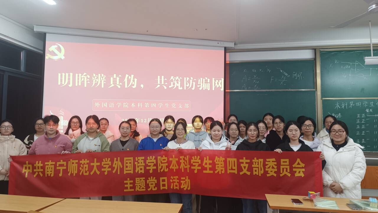 本科第四学生党支部在实验楼2C-302教室举办了以“明眸辨真伪,共筑防骗网”为主题的党日活动。
