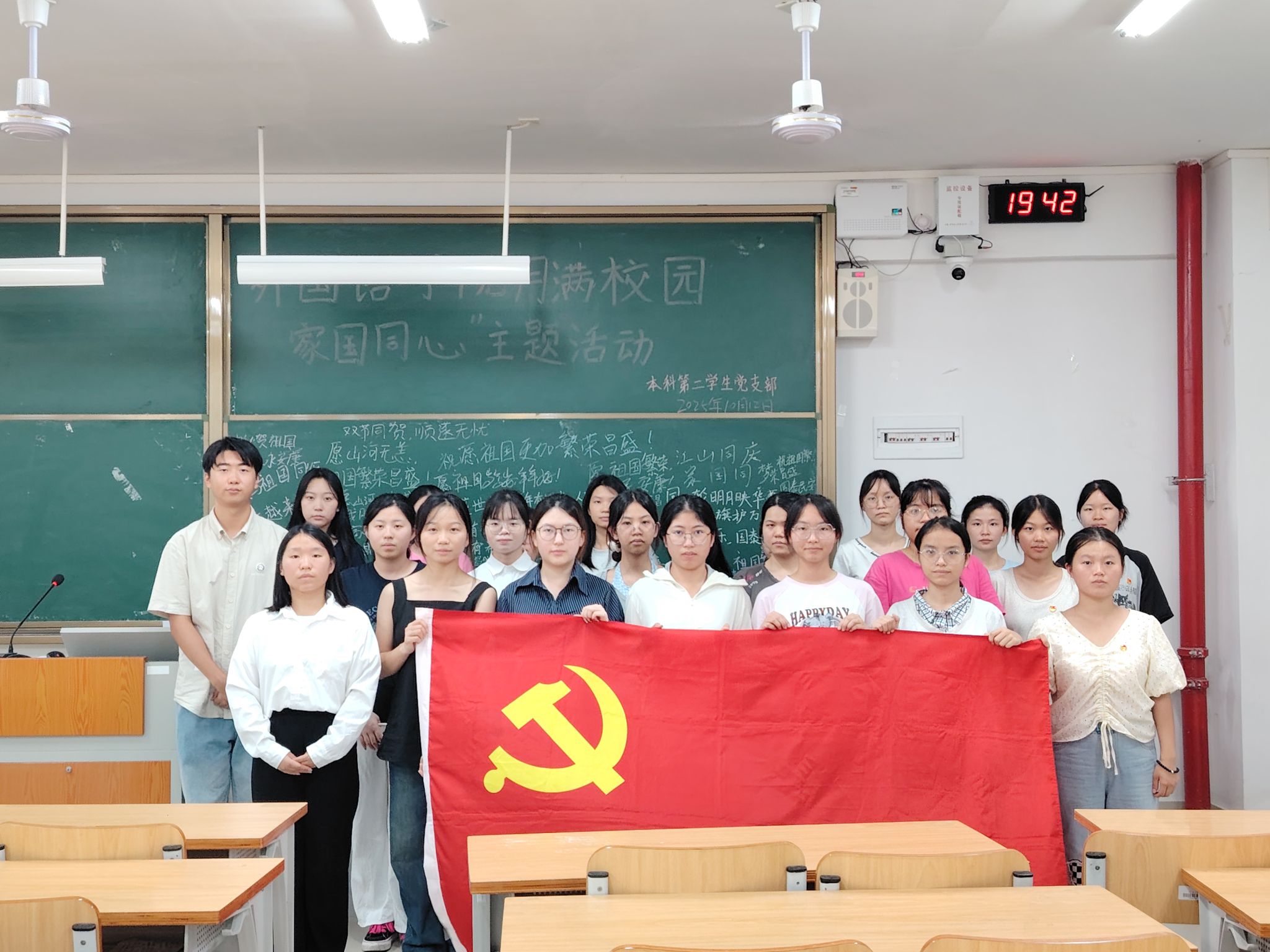 最后,在“集体写寄语”环节中,全体成员手执粉笔,在黑板上写下一句句对支部和家国的真挚祝福。