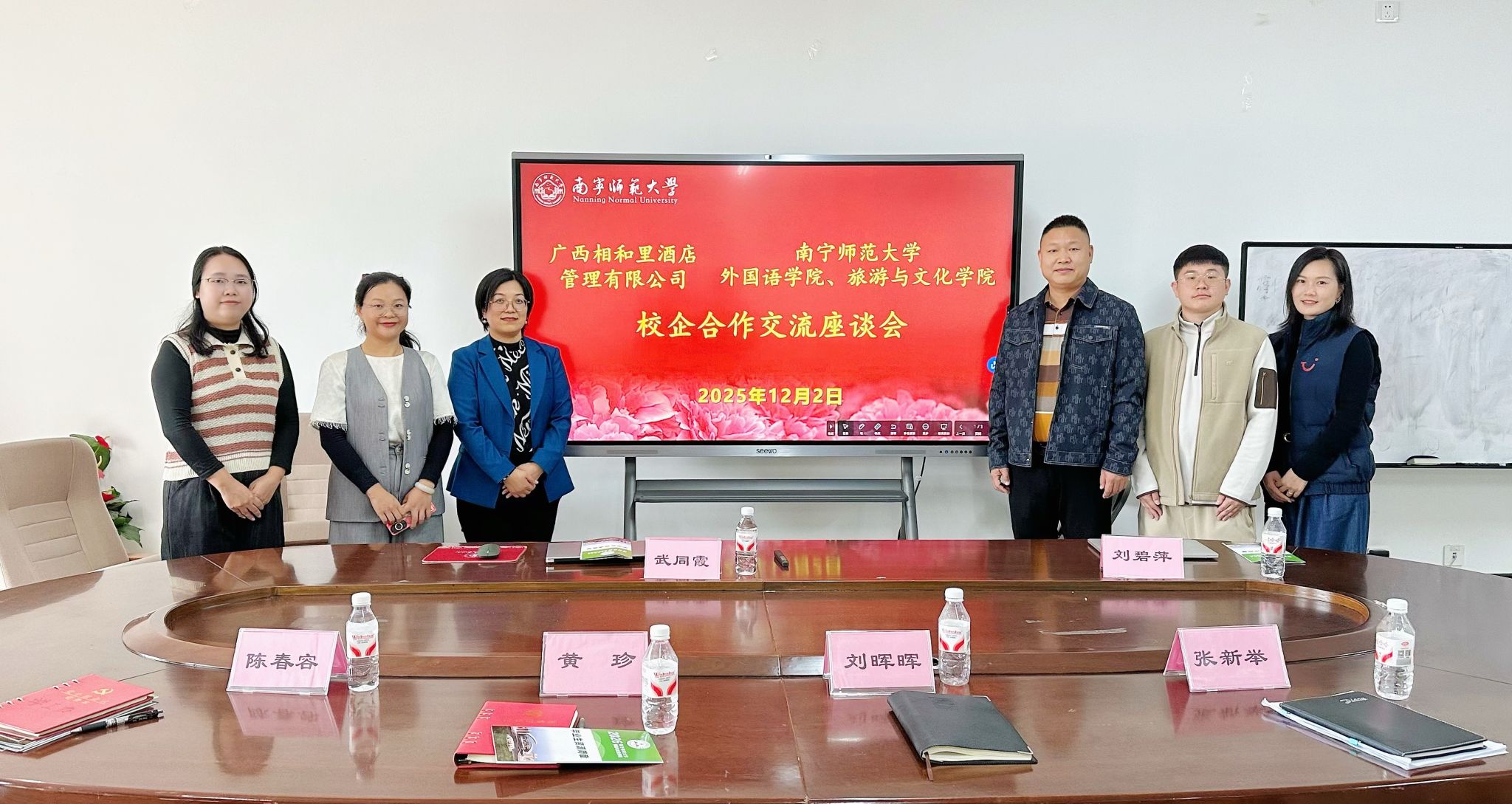 、旅游与文化学院与广西相和里酒店管理有限公司在武鸣校区实验楼1B-614顺利举行校企合作交流座谈会。双方围绕深化校企合作、协同育人等议题展开深入交流与探讨。广西相和里酒店管理有限公司总经理武同霞、总经理助理刘碧萍,国产自慰