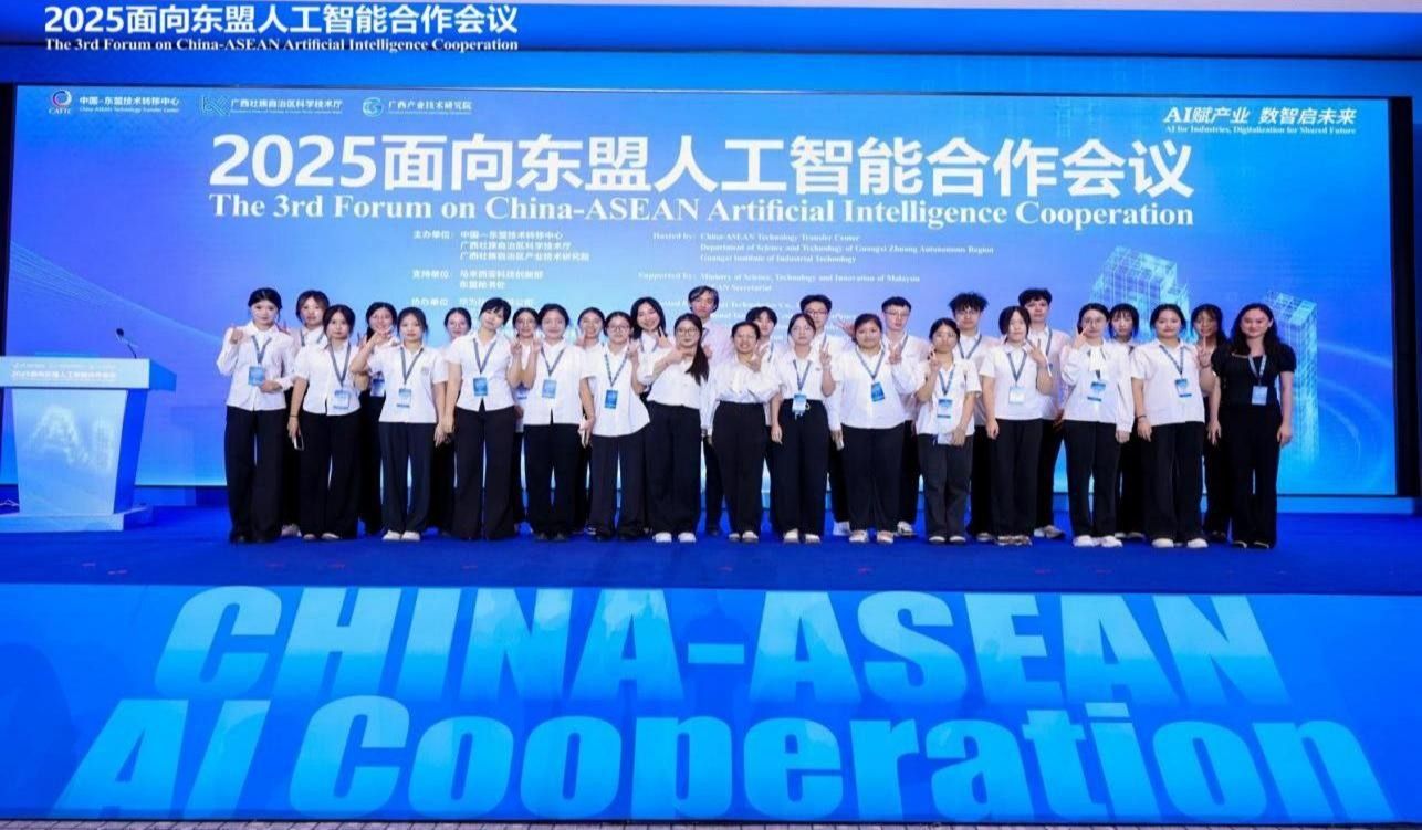 在“2025面向东盟人工智能合作会议”中,于子桐、丁美彤、曾凤仪、蒙世妍、陆海琼、王睿灵、阮娟娟、丁一桓、邱秋雨、梁永娜、李婷缘、曾彩雯、农海岚、覃秋杨、符玲萍、李盈绣等16名外院志愿者承担了国内、国外嘉宾及听众签到、同传现场监督、会场引导、物料整理等基础保障工作。出发前,组委会黄湘婷老师和我院庞奔奔老师开展了统一线上培训,分别围绕志愿岗位职责和外事注意事项进行说明;为期2天的志愿工作中,我院学子在展现“细致严谨”工作态度的同时,亦践行了“外事无小事”的工作原则:在筹备阶段,每一份物料的位置都经过仔细核对,确保来自不同国家的嘉宾都能感受细致入微的服务;在大会签到核销环节,凭借热情的态度和良好的沟通技巧,志愿者们熟练地用中英文为嘉宾提供签到引导、签到核销服务;在大会现场,志愿者们各展所长、分工协作,构成了一道活力满满的服务图景。