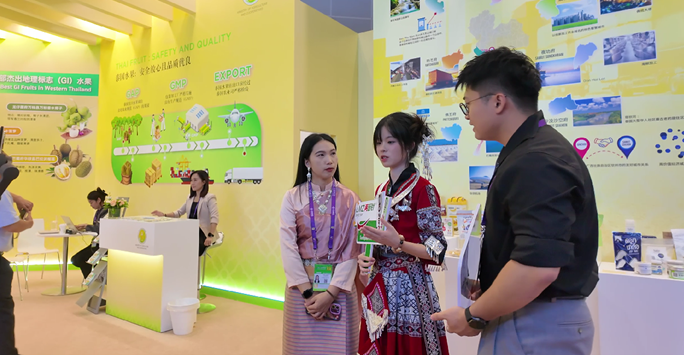 (会展中心“走播”期间,黎妍妍同学[中间]与泰国参展商交流文化体验)