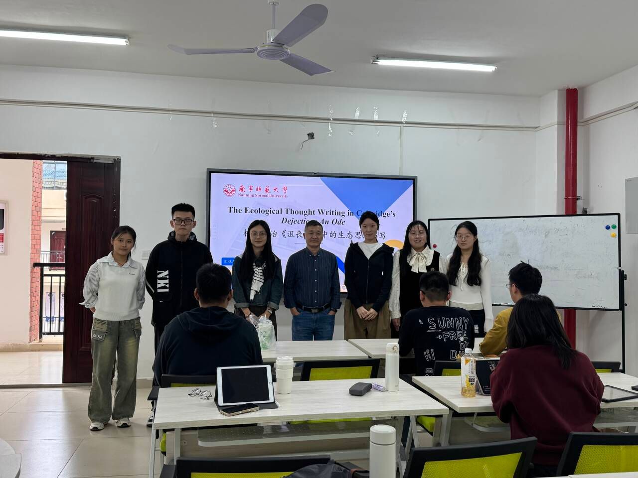文学专场中,5位汇报人聚焦文本分析与理论应用。周静静探讨《卢布林的魔术师》流散身份书写,路静怡以第三空间理论解析《喜福会》华裔身份建构,张璇结合客体关系理论分析《斯通纳》人物人格演化,万伟玲细读济慈诗歌文本形式与价值,张琳曦探讨了《沮丧颂》生态思想。