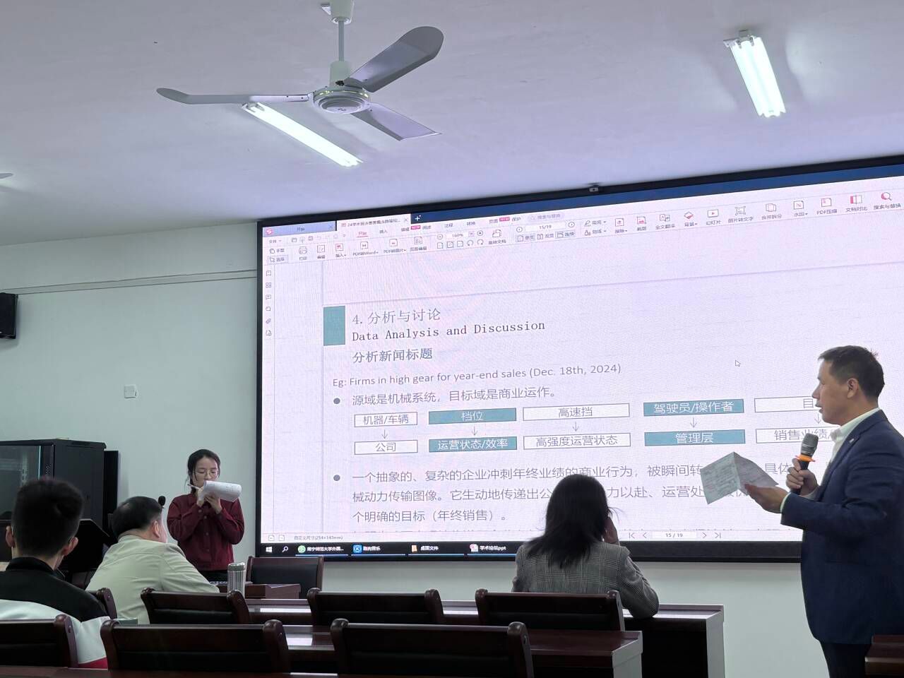 语言学专场中,5位汇报人围绕话语分析、隐喻研究等主题展开。陈丽夏以福柯理论分析《为奴十二年》的权力规训;蒋珊珊梳理英语论文写作规范与常见的模糊点;谢冰洋采用批判性话语分析来研究中泰新闻的包容性语言;章文惠探讨“广西小沙糖桔”等农产品网络热词模因现象;最后许茵茵研究《中国日报》新闻标题隐喻。
